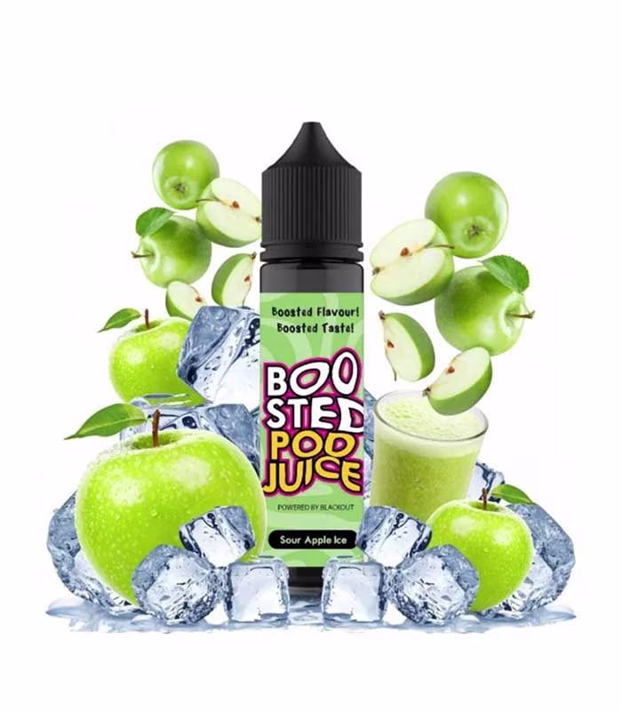 Το Blackout Boosted Pod Juice Sour Apple Ice συνδυάζει την έντονη, ξινή γεύση του πράσινου μήλου με μια δροσερή αίσθηση πάγου.